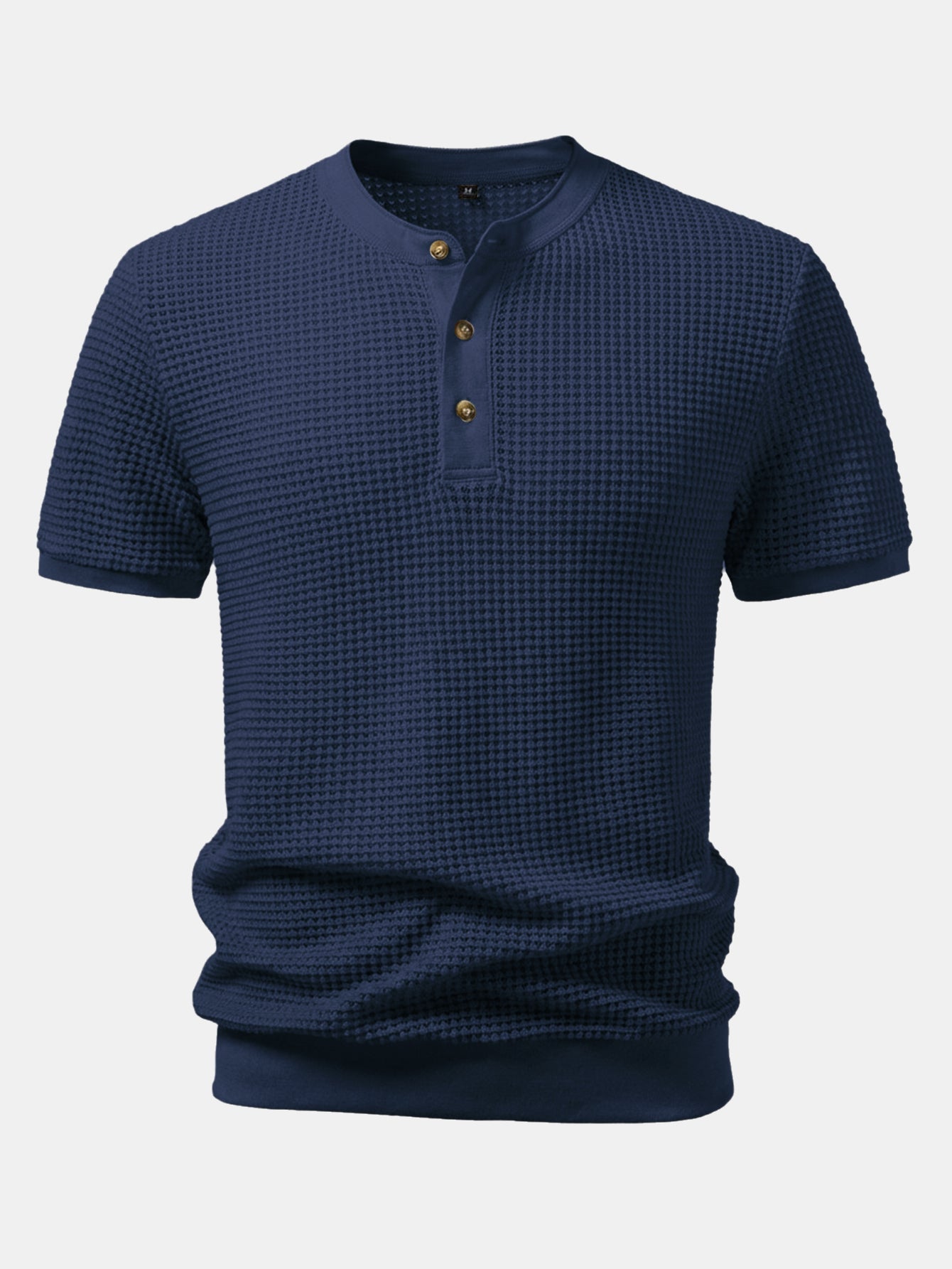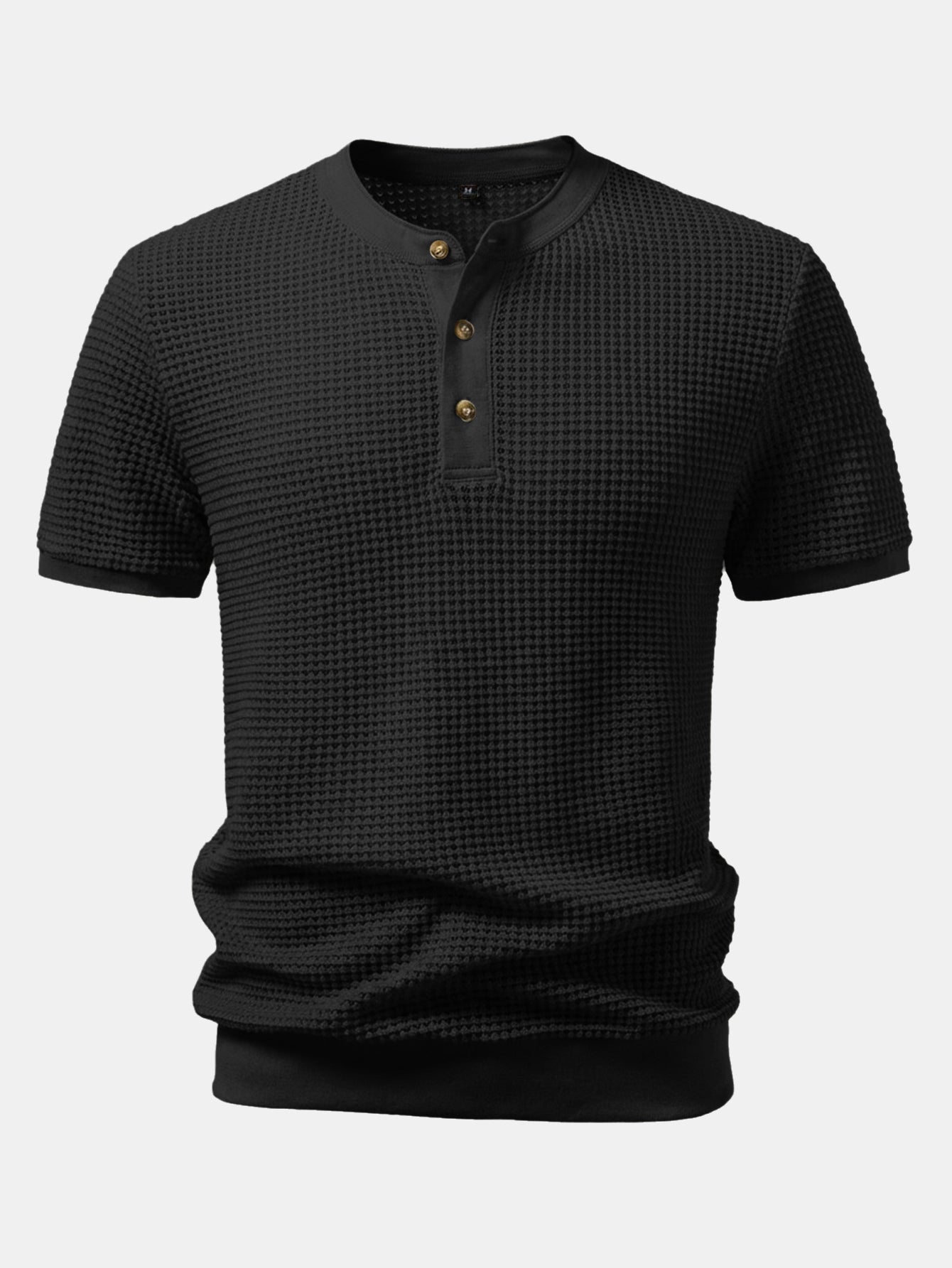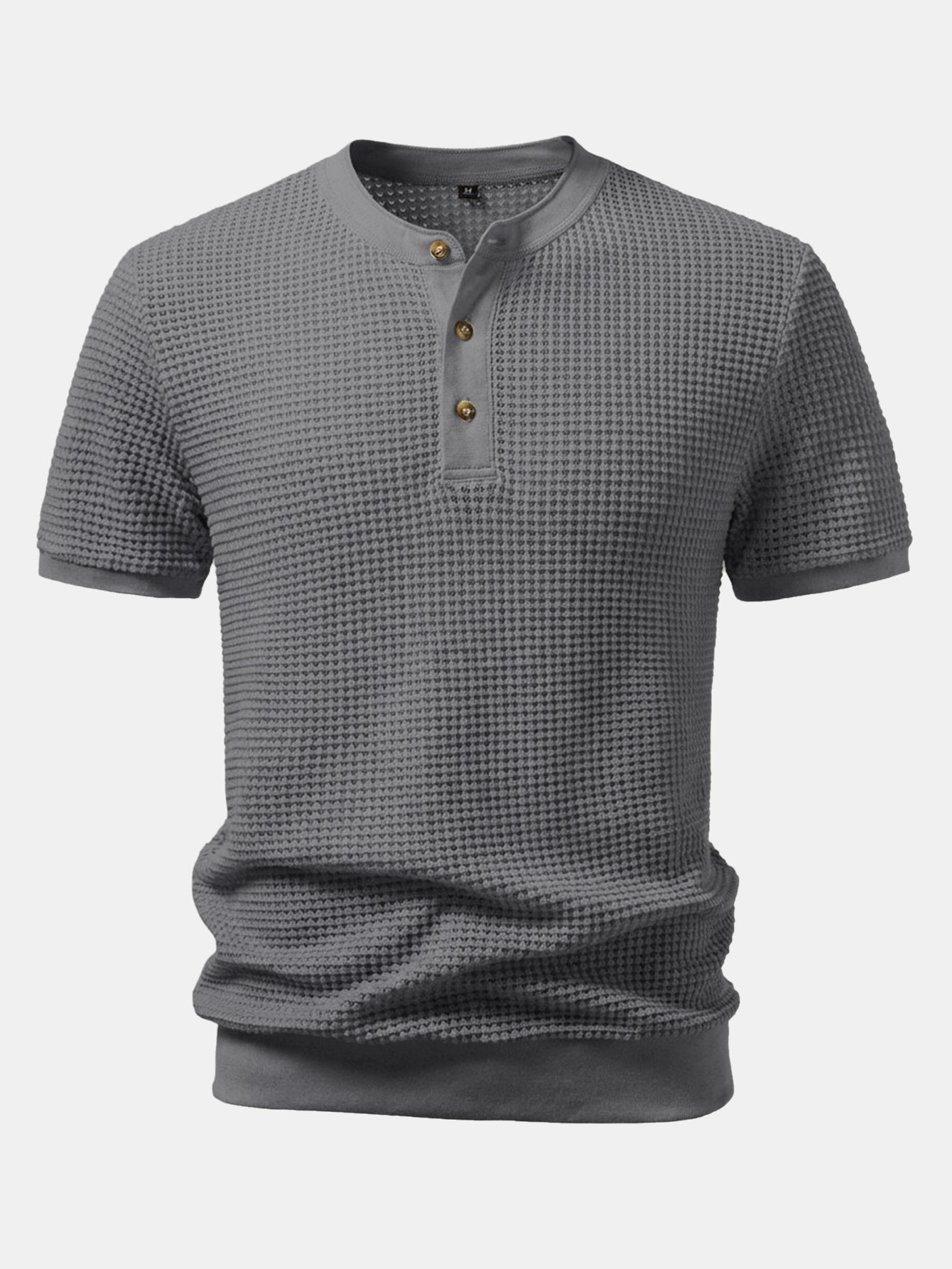 This short-sleeved T-shirt features a classic Henry collar design. The waffle fabric has a unique texture, is breathable and comfortable. The Henry collar is paired with three exquisite buttons, which is simple yet detailed, making it easy to wear for both daily leisure and light business occasions.