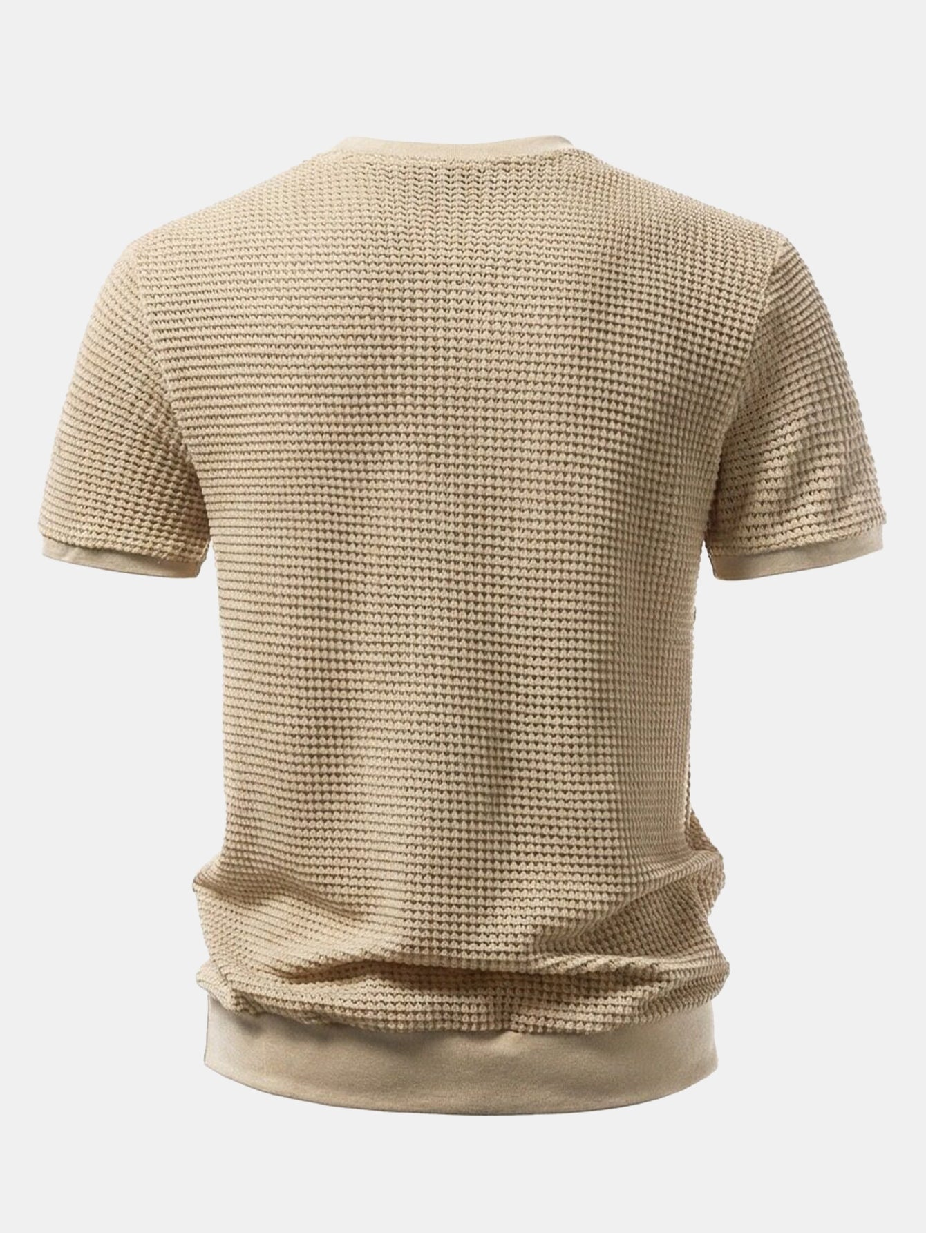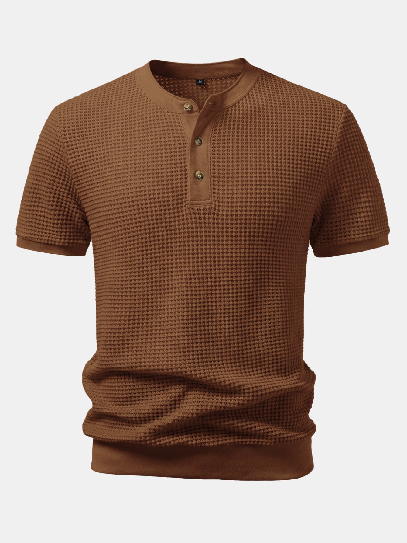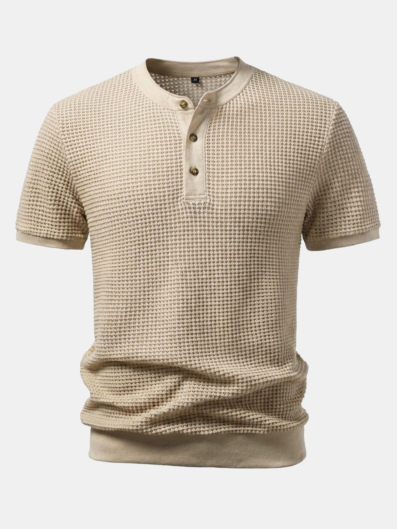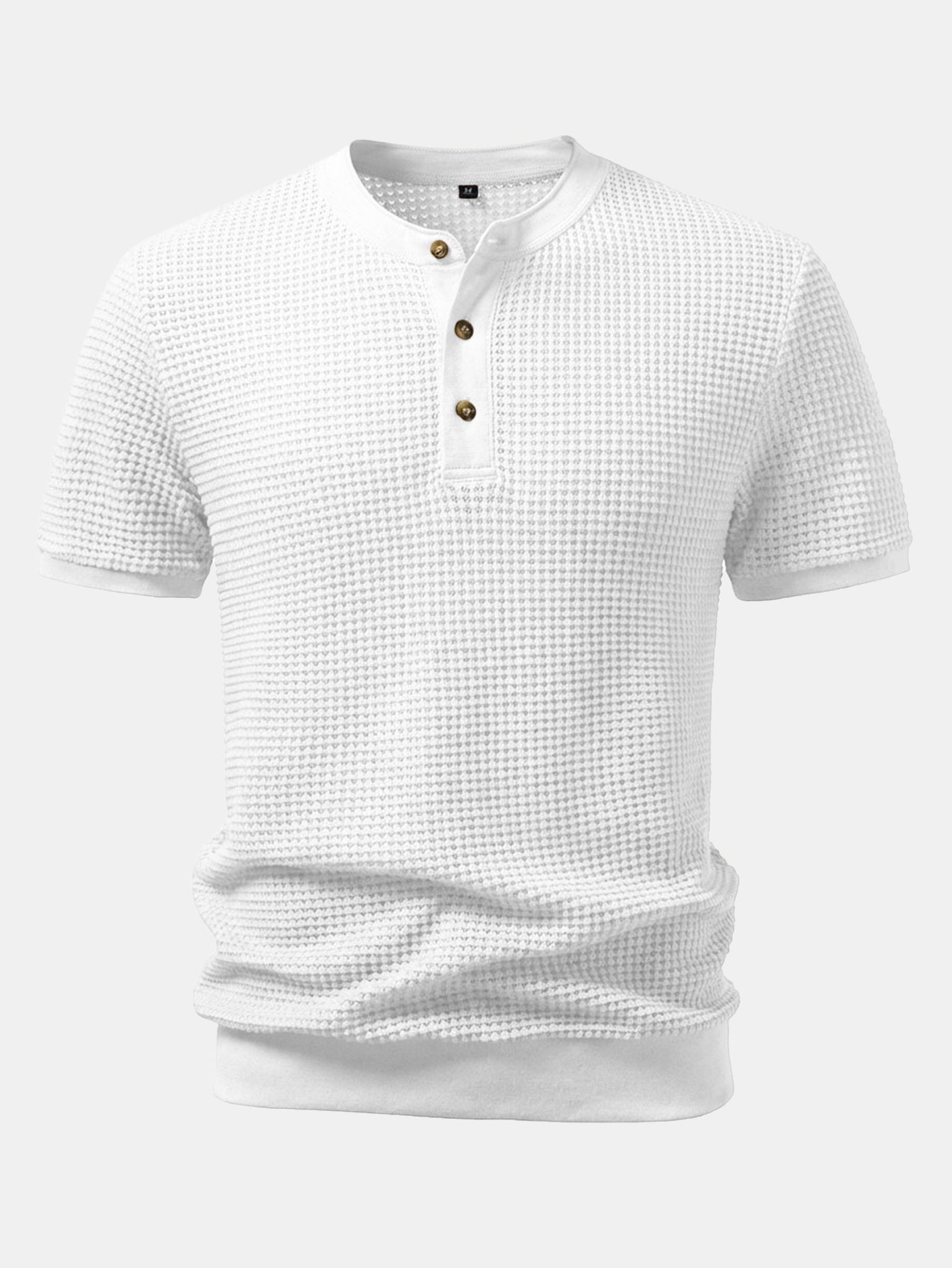 This short-sleeved T-shirt features a classic Henry collar design. The waffle fabric has a unique texture, is breathable and comfortable. The Henry collar is paired with three exquisite buttons, which is simple yet detailed, making it easy to wear for both daily leisure and light business occasions.